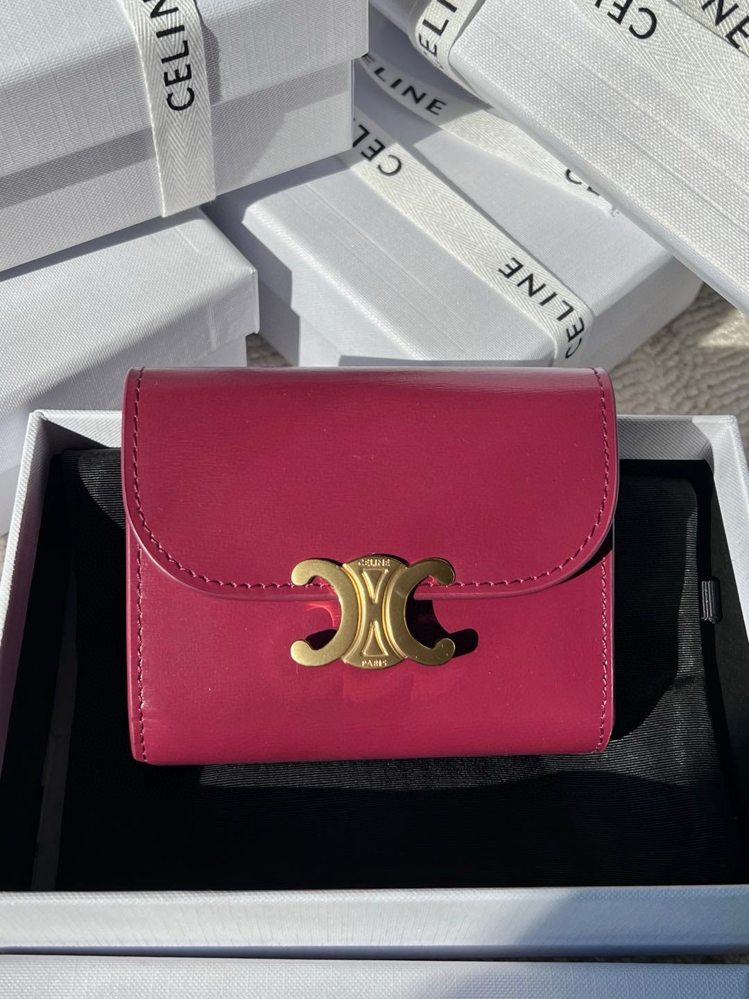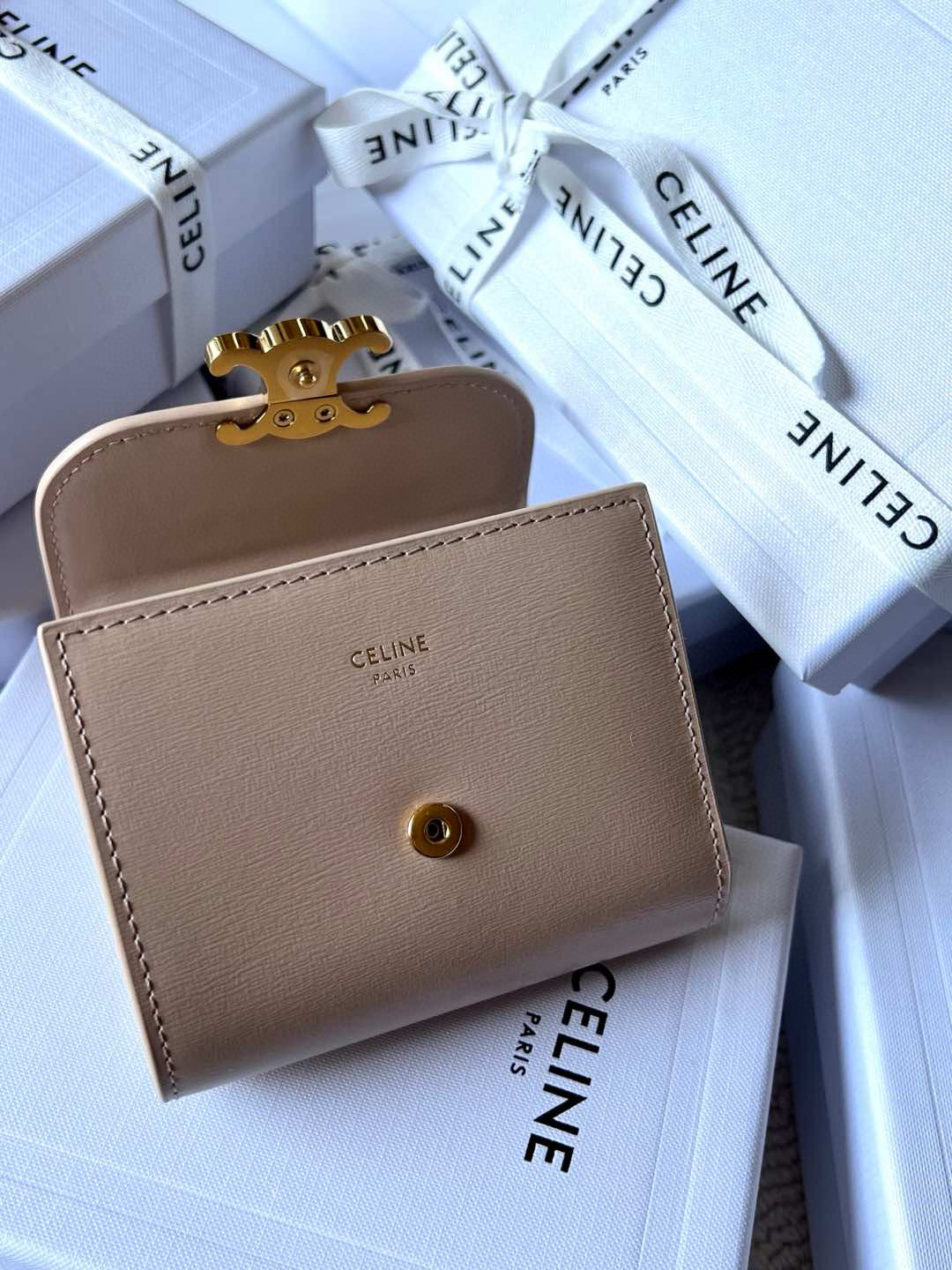 Discover timeless sophistication in the palm of your hand with the *ELINE Small Flap Wallet TRIOMPHE in shiny calfskin. Meticulously crafted from luxurious leather, this compact beauty showcases the iconic Triomphe clasp in gold-tone metal, a refined nod to Parisian heritage.