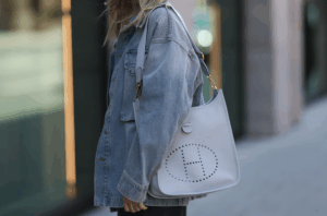 A stylish street look featuring a white leather bag with the iconic “H” logo, paired with a denim jacket.A stylish street look featuring a white leather bag with the iconic H logo paired with a denim jacket