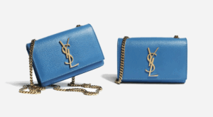 Two blue Yves Saint Laurent (YSL) handbags with gold logos on a white background.